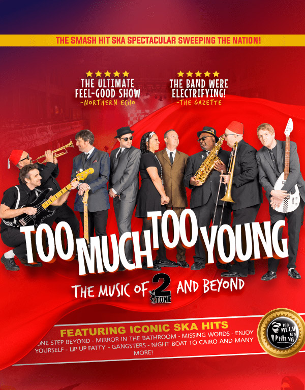 BACK BY OVERWHELMING DEMAND… The UK’s biggest Ska theatre experience sweeping the nation is back in St Austell for ONE NIGHT ONLY… Get ready for an electrifying night of music with Too Much Too Young – The Music of 2Tone & Beyond, a high-octane, two-hour spectacle that takes you on an unforgettable ride through the ska sound that shaped generations! This feel-good journey explores the birth of ska in Jamaica and follows its explosive history through to the British revival in the late ’70s and ’80s, celebrating the groundbreaking music and the legendary artists who made it a global phenomenon.